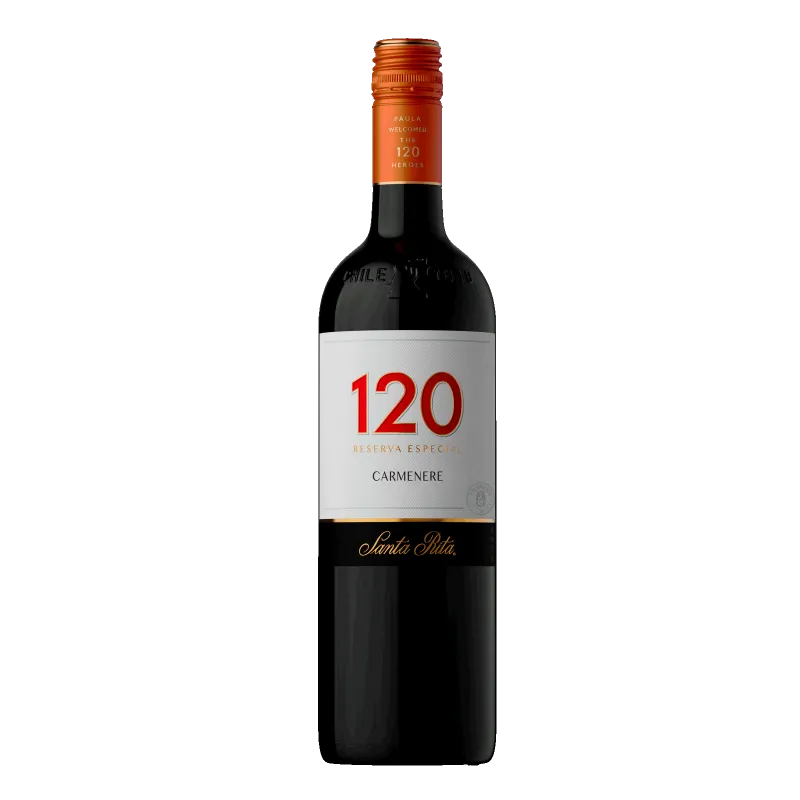 120 Carmenère Reserva Especial es un tinto chileno elaborado con 85% Carménère y 15% Syrah, cultivado en el Valle Central. Es un vino versátil con notas frutales, ideal para acompañar platos como conejo, codornices o faisán relleno. Su vinificación resalta la frescura y el equilibrio de estas variedades.